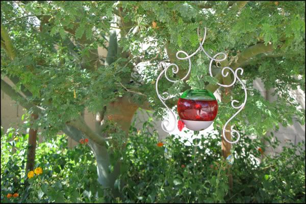 Mais ceci n'est pas une mangeoire à colibris mais ma mangeoire à colibris, placée dans mon jardin! Yeepiiiii! J'ai les clés! Je suis officiellement propriétaire de cette mangeoire. Le seul léger problème est que je ne peux pas encore habiter ma maison car les containers sont restés bloqués à Marseille à cause d'une grève des dokers....No comment. Vive la France.